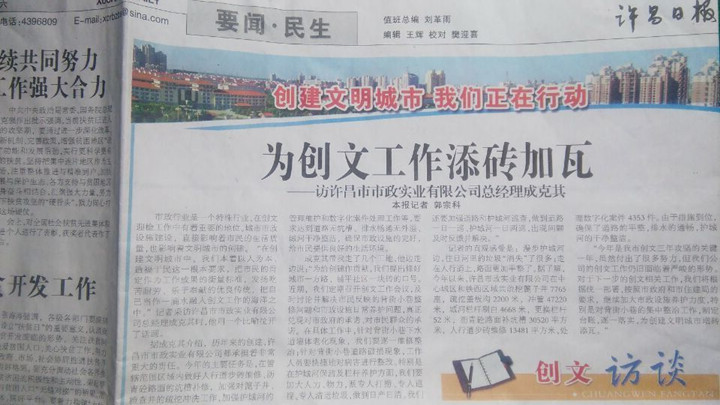 市政行業(yè)是一個(gè)特殊行業(yè),在創(chuàng)文迎檢工作中有著重要的地位。城市市政設(shè)施建設(shè),直接影響著市民的生活質(zhì)量,也影響著文明城市的創(chuàng)建!霸趧(chuàng)建文明城市中,我們本著以人為本、造福于民這一根本要求,把市民的肯定作為工作成果的衡量標(biāo)準(zhǔn),發(fā)揚(yáng)吃苦耐勞、樂于奉獻(xiàn)的優(yōu)良傳統(tǒng),把自己當(dāng)作一滴水融入創(chuàng)文工作的海洋之中!庇浾卟稍L許昌市市政實(shí)業(yè)有限公司總經(jīng)理成克其時(shí),他用一個(gè)比喻拉開了話題。