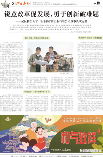 “面向未來、面向外部、面向創(chuàng)新”,這是許昌市市政實業(yè)有限公司的發(fā)展理念,也是成克其個人的座右銘。他將自身的創(chuàng)新意識、好學(xué)精神、吃苦耐勞的品格,注入到企業(yè)發(fā)展的血液中,讓企業(yè)在未來的天地中飛得更快、更高、更遠!